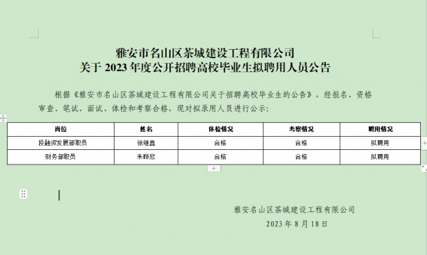 雅安市名山區(qū)茶城建設工程有限公司關于2023年度公開招聘高校畢業(yè)生擬聘用人員公告