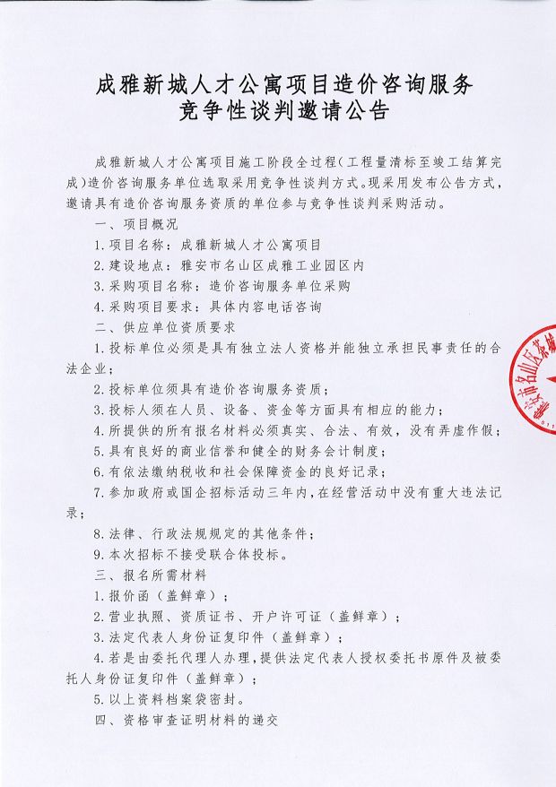 成雅新城人才公寓項(xiàng)目造價(jià)咨詢服務(wù)競(jìng)爭(zhēng)性談判邀請(qǐng)公告